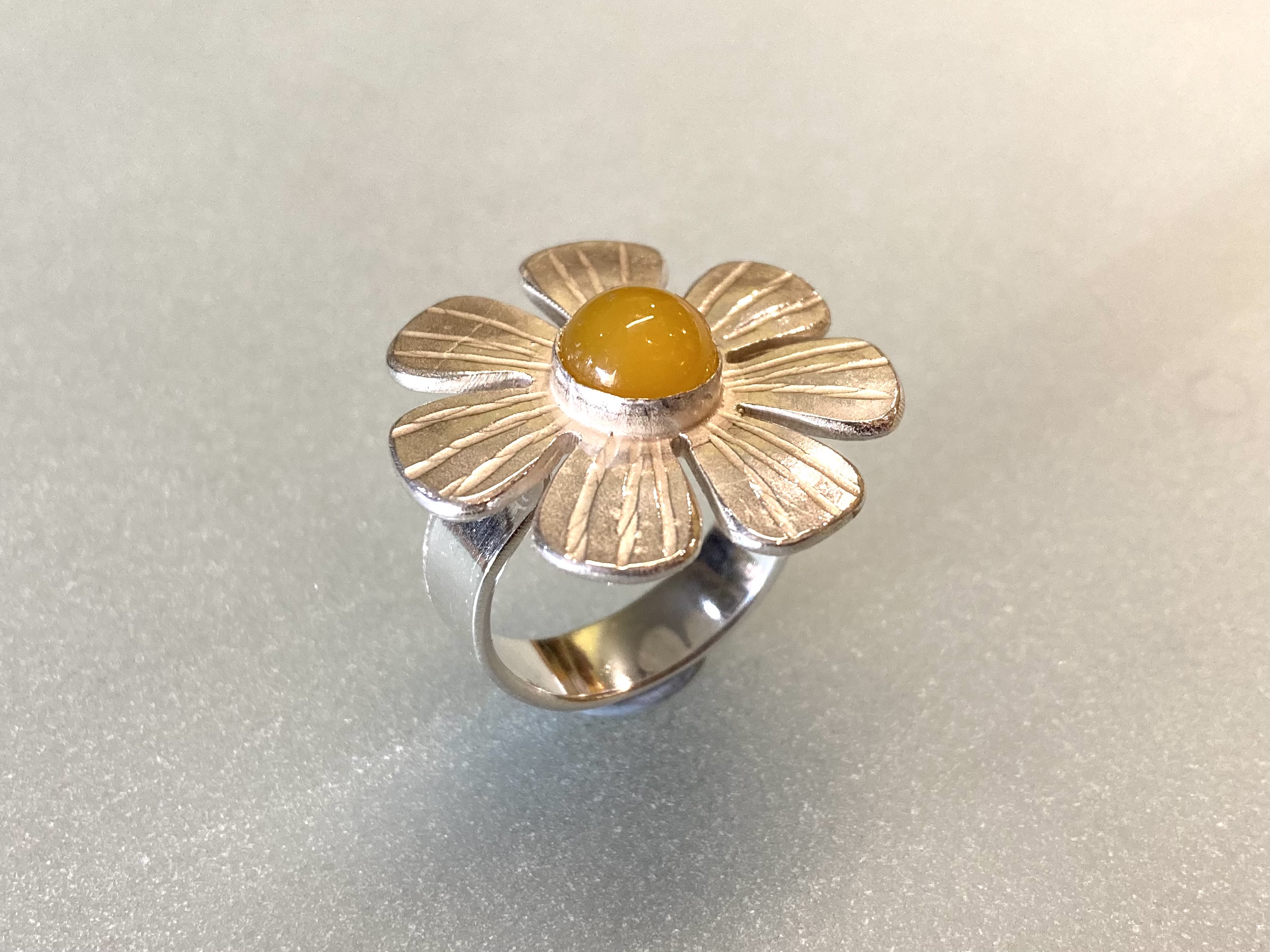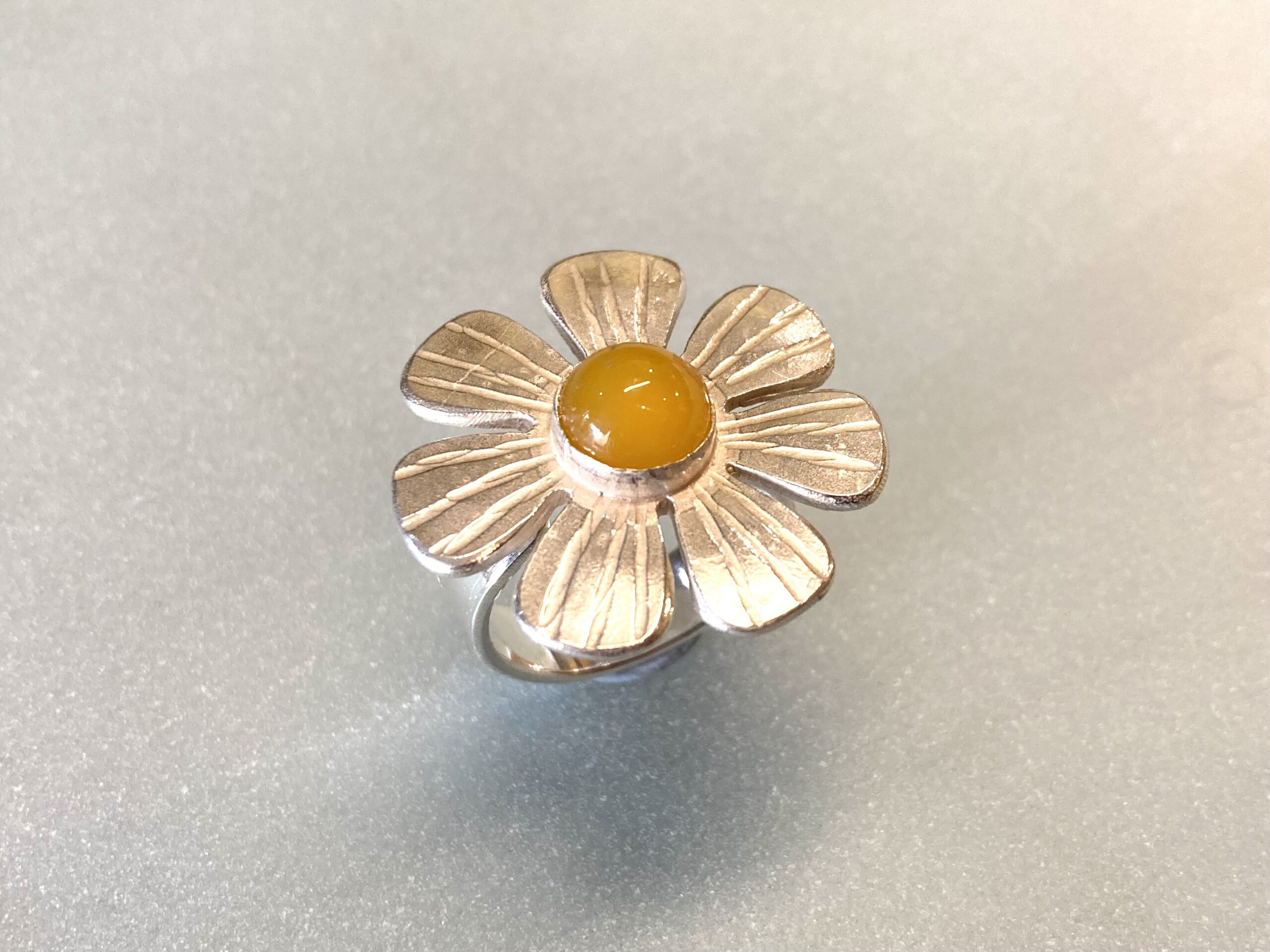 Päivänkakkara sormus. Kierrätys 925 hopeaa. paino 9.5 g. kukan leveys 28 mm. Kivi keltainen akaatti.