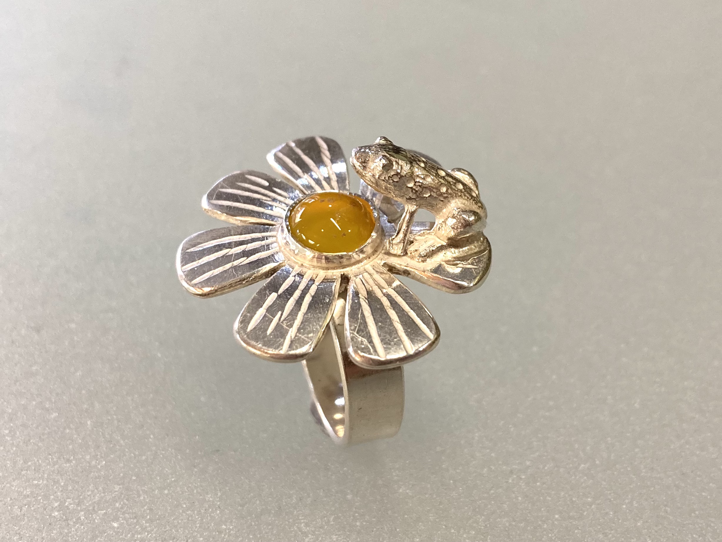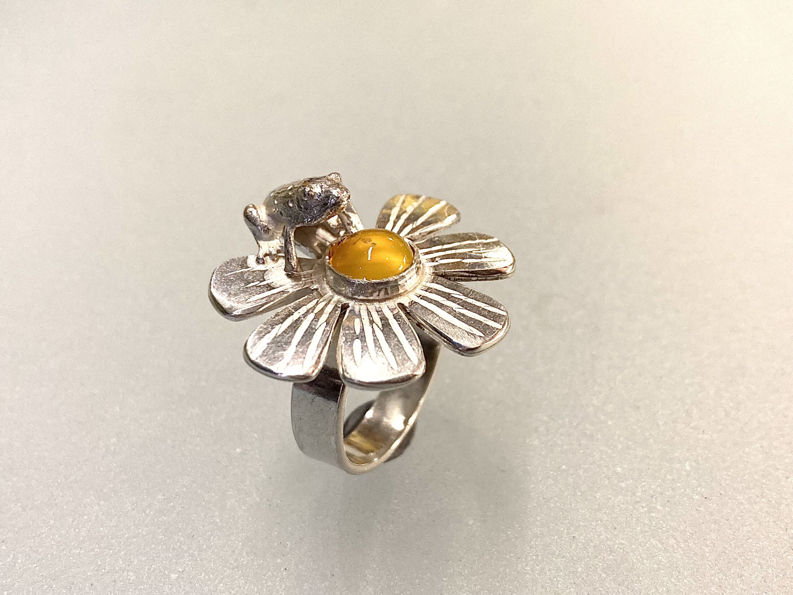 Sormus ” Sammakko Päivänkakkaralla”. Kierrätettyä 925 hopeaa, ei sis, nikkeliä. Akaatti kivi.